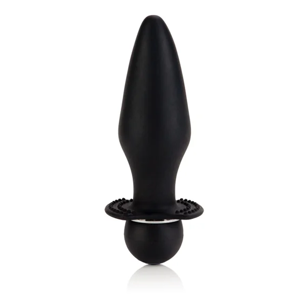 Vibrating Booty Rider Silicone Black. Soft and smooth, vibrating Silicone probe with nubby base. 10 powerful functions of vibration, pulsation and escalation. Push button control with LED light. Hold for 3 seconds to turn off. Hygienically superior and body safe. Materials: Silicone probe, ABS plastic with polyurethane PU Cote cap, ABS plastic with Silver Plating decor. Vibrator requires 1 AAA battery, not included. Bulk weight 3.4 ounces. 4.25 inches by 1.5 inches.