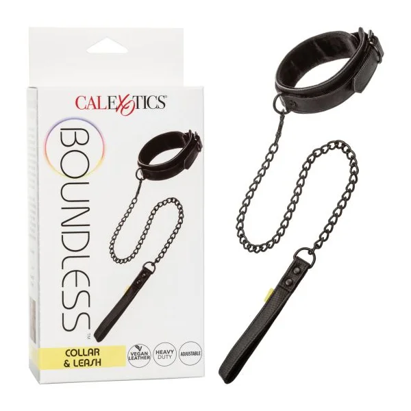 Boundless Collar and Leash set from California Exotic Novelties. Looking for a hot lead? Better get a Boundless Collar with Leash! This adult toy spices up the kink, bringing into the bedroom a sturdy collar with a detachable leash. This fully adjustable collar comes with a secure buckle closure with a solid buckle design, giving the maximum possible restraint, with the ease of secure, quick adjustment when you need it. For couples or individuals, the heavy duty metal chain is designed for the most pure in fun. Universal clasps on a D-Ring frame set allow for adjustments and re-use of all kinds, while the plushy interior gives the wearer comfort, without the wrong kind of rub. You would never know how comfortable this collar is just by looking at the solid buckle design, the sturdy chain, and the double stitched design, but while the double padded, textured leather announces its presence, the fact that it is actually vegan leather does so in a cruelty free way. So what are you waiting for? Do you need someone to grab you by the collar to show you this? Or are you going to take charge and buy the Boundless Collar with Leash on your own? Specifications: Color Black. Materials Polyurethane, Polyester, Nickel Free Alloy, Iron. FeaturesPhthalate free. 90 days warranty. Measurements 19.5 inches maximum Collar circumference diameter. Bulk weight 7.9 ounces, Package 9.3 ounces. Package 2 inches by 4 inches by 8.5 inches. Categories: Bondage, Fetish, Kink, Bondage Restraints, Collar and Leashes, Sex Toys for Couples. 2023.