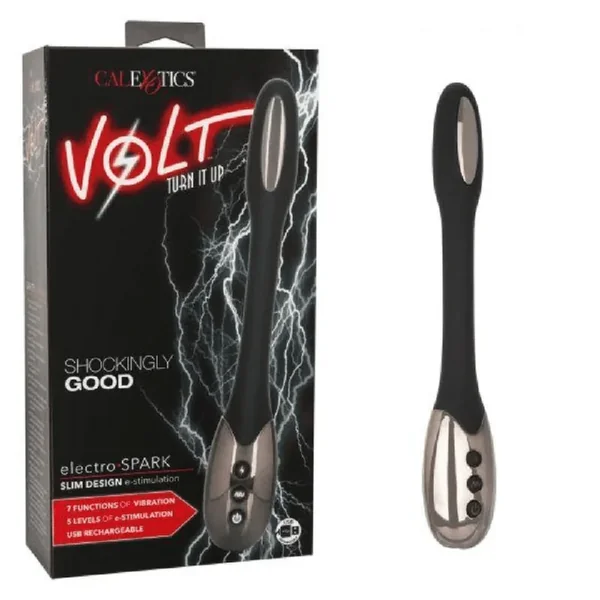 Ignite your passion with the Calexotics Volt Electro-Spark, a cutting-edge electro-stimulation massager designed for exhilarating pleasure. This versatile, slim wand boasts unmatched flexibility, allowing you to customize its angle for precise stimulation. With 5 independent e-stim levels and 7 powerful vibration functions, this innovative toy offers endless combinations to electrify your senses.