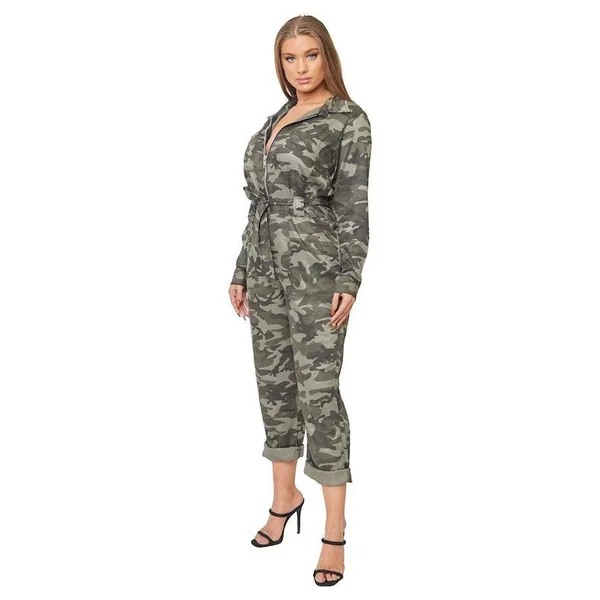 Denim Jumpsuit in Camo Print features front zipper closure