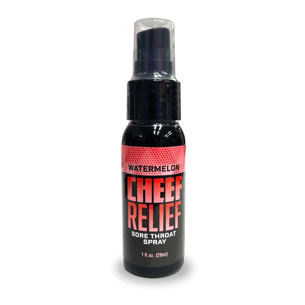 Cheef Relief Watermelon Sore Throat Spray 1 fluid ounce from Little Genie Novelties. The ultimate solution for smokers seeking relief from dry cough and itchy throat. Our carefully crafted formula targets and relieves the pesky irritations associated with smoking. Experience comfort and relief with Cheef Relief your passport to a smoother, more enjoyable smoking experience. Cheef Relief has six delicious flavors: Cherry, Cinnamon, Mint, Peach, Strawberry, and Watermelon. Each sold separately. Cheef Relief soothes throat irritation and soreness on contact. Available in six delicious flavors, including Cherry, Cinnamon, Peach, Mint, Strawberry and Watermelon. Cheef Relief is the ultimate solution for smokers seeking relief from dry cough and itchy throat and comes in a 1 ounce leakproof spray bottle with a spray head and cap. Active ingredient: Benzocaine 5% oral aneosthetic. Categories: Lubricants, Desensitizing, Flavored, Oral Products, Sprays, Health and Beauty Aids. 2023.