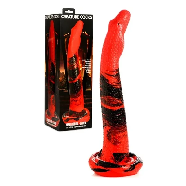 The tip of the silicone dong is shaped like a cobra head. You’ll enjoy that wide flare of its wide neck as it pops inside. The tapered, round nose makes insertion easy. It has a vibrant red and black body with textured scales that go all the way to the coiled base!