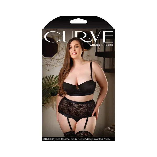 Elevate your intimate wardrobe with the Curve Chloe Keyhole Contour Bra & Gartered High-Waisted Panty Black 1X/2X. Shop now at Fantasies Boutique and unleash your inner goddess!