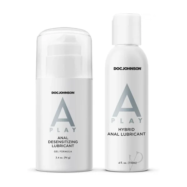 Make anal play easy with this A-Play 2-piece set! It includes two types of lube: Hybrid, which is a combination of silicone and water-based lube, and Desensitizing, which relaxes your muscles for easier anal play.