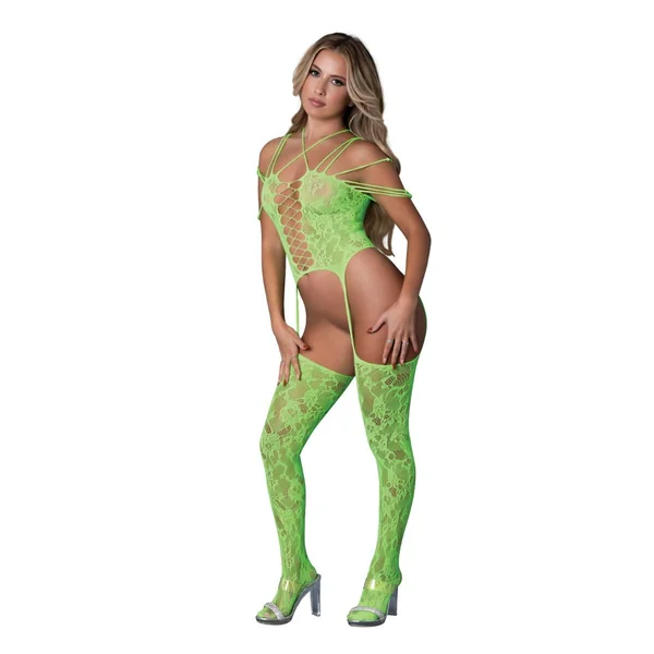 Seamless body stocking from Exposed by Magic Silk. This ultra-stretchy gartered catsuit features shoulder straps and bold strappy cutout details, designed to hug and flatter every body type. Infused with clear rhinestones for a dazzling touch.