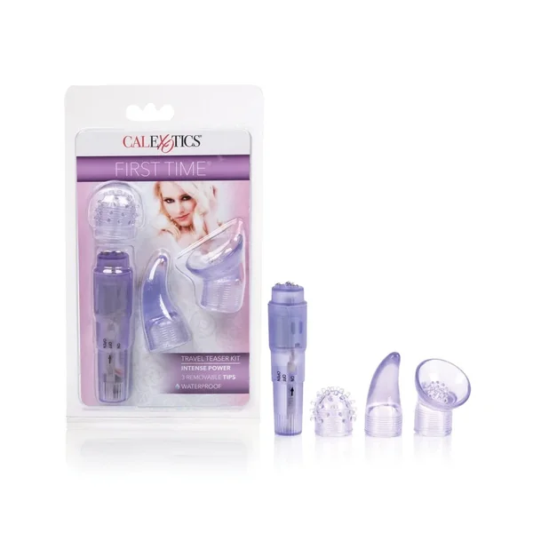 First Time Travel Teaser Kit from Cal Exotics. First Time…velvety soft pleasure products and playful fetish gear designed for first time or experienced users. Make it a memorable experience with the First Time Collection. Discreet and powerful lighted pocket massager. 3 interchangeable pleasure tips. ABS with PU Cote (massager) TPE (attachments). 4″ x 1″/10.25 cm x 2.5 cm (massager). 1.25″ x 1.25″/3.25 cm x 3.25 cm (nubby attachment). 2.25″ x 1″/5.75 cm x 2.5 cm (G-attachment). 2″ x 1.5″/5 cm x 3.75 cm (scoop attachment). Requires 1 AA Battery.