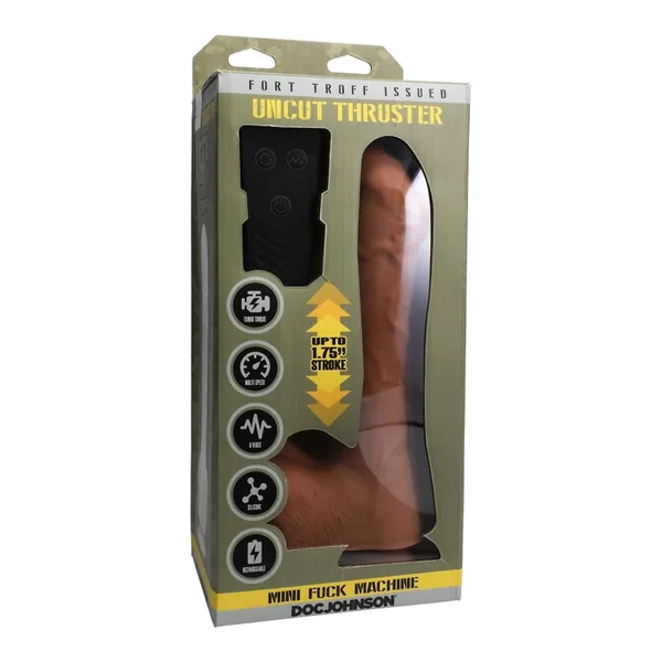 With the Uncut Thruster, its all about the back-and-forth stroke to deliver the real feel of a hard poundin, uncut Top. With a stroke of just under 2 inches, this thruster nearly matches the stroke of big fuck machines.The super charged engines of the Uncut Thruster deliver the power to drive deep. We made sure its strong enough to penetrate the tightest holes. The mushroom-shaped head is super soft n cushy, for EZ entry.Controlling this power top is easy use the remote or the buttons on the balls. You have 2 speeds of fuckin, which offer slightly faster versions of the basic stroke. Unlike traditional fuck machines, ours also offers 8 vibration settings.Powered by a state-of-the art lithium battery, the run time is around 45 minutes. USB rechargeable, and it takes about 1.5 hours to recharge. Made of Premium Liquid Silicone, so you can use any lube. While the Uncut Thruster is not whisper quiet, we felt that an engine with a little roar was essential to deliver the thrust that piggy holes crave.Features:Made from Liquid SiliconeHole Boppin’ Cush Head1.75 Inch Stroke8 Vibes and Multi-SpeedTurbo Torque EngineScooch-Free Strong Suction-Cup BaseUse with Included Remote for Hands-Free PlayUSB Rechargeable – Cable Included – Charging Time 90 minutes, Usage Time 45 minutes