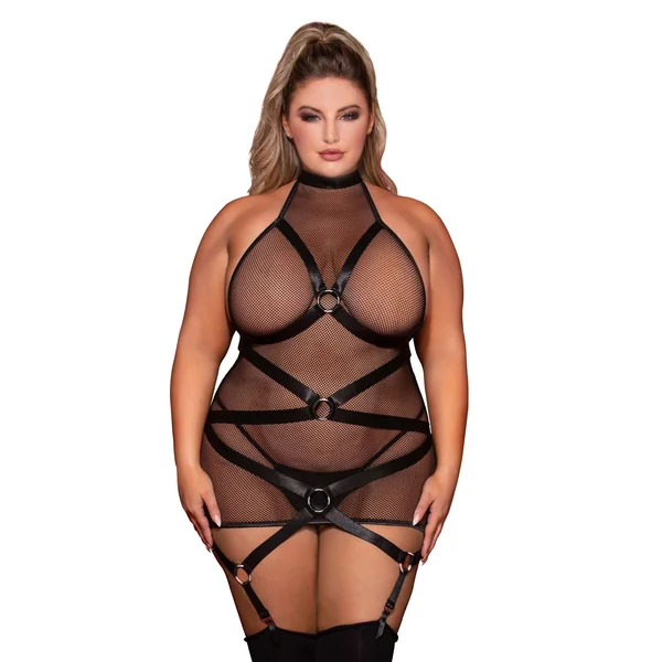Stretch fishnet halter garter slip featuring:
