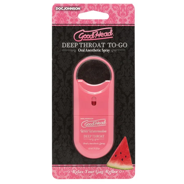 GoodHead Deep Throat Spray To Go Watermelon .33 fluid ounces from Doc Johnson. Go down easier. GoodHead Deep Throat Spray mildly numbs the back of the throat and suppresses the gag reflex to allow deep oral penetration without discomfort. This functional, flavorful spray is formulated for minimal medicinal taste and maximum effect in a variety of mouth watering flavors. Features: delicious throat desensitizer. Helps minimize gag reflex. Mild numbing agent. Freshens breath. Easy to use spray nozzle. Directions: spray into throat. One spray per use. Adults only. Warnings: allergy alert do not use this product if you have a history of allergy to local anesthetics such as procaine, butacaine, benzocaine or any other caine anesthetics. Active ingredient Benzocaine 5%. Proudly, made in America.