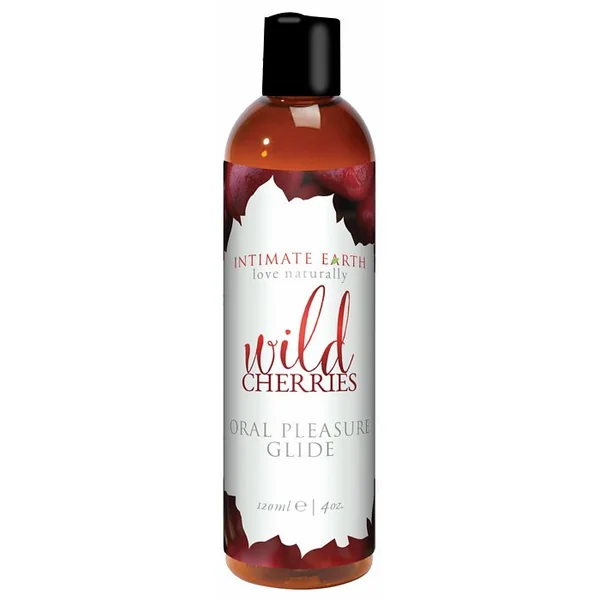 Intimate Earth Glide Wild Cherries 4 fluid ounces. Smells light, sweet and fruity, with a decadent richness thats hard to match. The flavor is very sweet, exceptionally yummy and highly addictive, tasting like a mouth watering cherry candy you just can not get enough of. Ingredients: Aqua, Glycerin, Hydroxyethylcellulose, Flavor, Citric Acid, Potassium Sorbate, Sodium Benzoate, Stevia, Rebaudiana Leaf Extract, Aloe Barbadensis Leaf Extract, Cymbopogon Schoenanthus Extract, Lycium Barbarum, Goji Fruit Extract. Organic ingredients Made in the USA