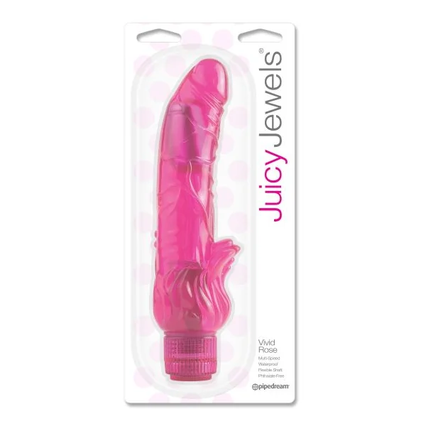 Juicy Jewels Vivid Rose Vibrator from Pipedream Products. Diamonds used to be a girl’s best friend, until they tried one of these precious Juicy Jewels. Realistic phallic vibrator comes with a curved head followed by natural folds and creases plus thick veins on the shaft. The lower portion features a splash on clitoral waves. Probe can be used to stimulate the vagina, G-Spot and clitoris. Made from super soft phthalate free jelly, these incredible vibes deliver thrilling sensations and lasting satisfaction, in or out of water. Clean up is a snap after the fun with Pipedream toy cleaner and warm water. Use plenty of Moist lube for an extra wet, extra wild encounter. Waterproof design is perfect for the shower, hot tub or spa. Powerful multiple speed vibration. Bendable shaft curves to your body’s contours. Perfect for beginners. Vibrating sex toy requires 2 AAA batteries, not included. Materials: ABS Plastic base, Thermoplastic Elastomers TPE. Vibrator measures 9.1 inches long by 2.6 inches wide. Package depth 2 inches, width 6 inches, height 11.75 inches. Packaged Weight 11.40 ounces. Country of origin China. Categories: Vibrators, Dildos, Dongs, Realistic, Dildos and Dongs Realistic. Restricted, Amazon Restricted. 2024.