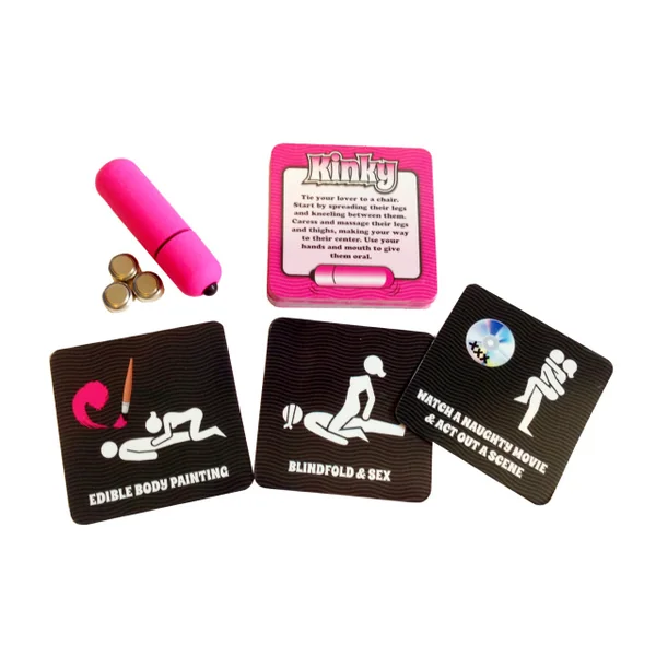 Kinky Vibrations Adult Game from Ball and Chain Fun. A kinky game to make lover’s quiver! Batteries and kink included. Add some sparks to your sex life with Kinky Vibrations game. Kinky Vibrations Game how to play: option 1: deal 12 cards from the deck and arrange the cards in a circle, sex position side down. Flip a random card over from within the circle to reveal a sex position. Place the mini vibrating toy in the center of the circle. The toys black button is the pointer. Players take turns spinning the toy and performing the activity listed on the card chosen by the pointer. The first person to spin and land on the sex position card wins the game and must incorporate the position into their lovemaking. Only one spin of the toy per player per turn. Players can choose to keep the foreplay going by inserting more cards from the deck. Option 2: a Quickie! Deal 12 cards from the deck and arrange the cards in a circle, sex position side up. Players take turns spinning the toy and performing the sex position activity pictured on the card. Includes 25 kinky foreplay activities, 25 sex positions and one powerful mini bullet that will give lover’s just the right kind of kinky satisfaction. Kinky Vibrations Adult Game from Ball and Chain Fun. Categories: X-Rated Adult Games, Sensual Kits, Vibrator Kits, Novelty Vibrators. 2024.