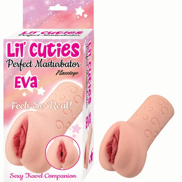 Lil Cuties Perfect Masturbator Eva from Nasstoys of New York. Sexy travel companion. Soft, tight and realistic. Textured suction tunnel for the real feel. Waterproof, non-vibrating stroker. Phthalates free, body safe materials Thermoplastic Rubber TPR. Size length 4.5 inches, width 2.5 inches, circumference 7.25 inches. Categories: Male Masturbators, Sex Toys for Men, Solo Masturbators, Pussy Stroker. 2022.