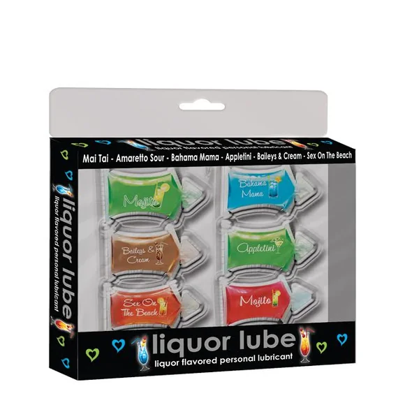 Liquor Lube 6 Pack assorted flavors from Hott Products Unlimited. Now you can get your Sexual Buzz on with Liquor Lube. Liquor Lube is a specially formulated premium quality water based personal lubricant that comes in Seven Delicious Flavors of your favorite Cocktail. All Liquored Up takes on a whole new meaning when you and your partner are ready for delectable edible action! Flavors include: Mai Tai, Amaretto Sour, Bahama MamaAppletini, Mojito, Baileys & Cream, Sex On The Beach.