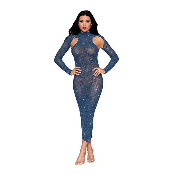 Long-Sleeved Seamless Open Back Bodystocking Gown w/Rhinestone Detail – Twilight Blue O/S