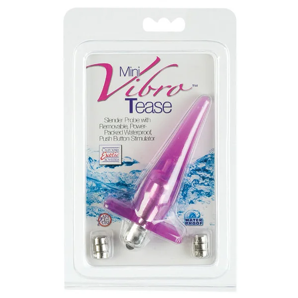 The Mini Vibro Tease from Cal Exotics is a slender probe with removable, power-packed, push button stimulator. Batteries included (3 watch, 6 included). 4″ x 1″.