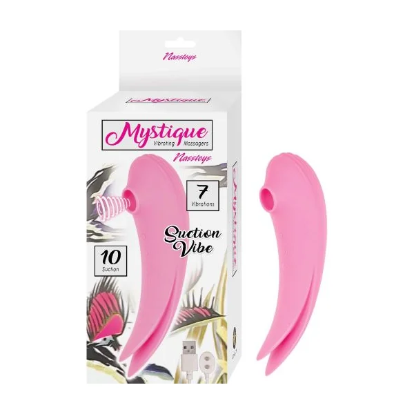 Mystique Vibrating Suction Vibe Pink from Nasstoys of New York. Mystique Suction Vibe is two unique stimulators in one! At one side, there are 10 tantalizing suction patterns while the other side delivers 7 buzzy sensations. Both can be used to stimulate the clitoris, nipples, and more! Press and hold the center button to power on. To turn on the suction, press the top button closest to the suction opening. To turn on the vibration, press the button below the power button. Press and hold the power button to turn off. To charge, connect the magnetic charging points on the charger to the base of the product then plug the USB end into a power source. Please clean with toy cleaner before and after each use. Enjoy with a Water Based Lubricant. Additional information: 10 suction, 7 vibrations. Dual motors. Body safe Silicone. RoHS compliant. Phthalates free. Waterproof vibrations. Materials: Silicone and ABS Plastic. Size: length 6.5 inches, width 2 inches. Rechargeable vibrator. Charging time 2 hours, working play time 2 hours, Voltage 3.7V. Categories: Vibrators, Clitoral Vibrators, Rechargeable Vibrators, Sex Toys for Women, Clit Cuddlers. 2023.