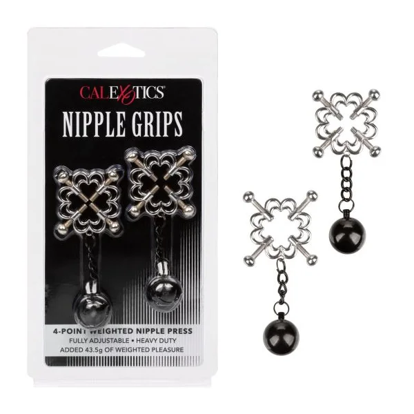 Nipple Grips 4 Point Weighted Nipple Press from California Exotic Novelties. The Nipple Grips 4-Point Weighed Nipple Press is designed for sensational nipple play. Tighten the screws to exactly the pressure you desire, and let the weights pull and tug for even more intense pleasure. 2 multi-use clamps are included with your purchase. Play with both, or use just one at a time. These clamps allow you to play any way you desire. Plus, you can use them alone or with a partner. The fully adjustable, screw down 4-point press lets you control the pressure. Screw tighter, or loosen for a totally customizable pleasure experience. The fully adjustable design also allows for use on all body types. Experience increased stimulation with the sensual weights. They look sexy while also providing added sensation. The weights gently tug, move and sway with the body. While youre playing, the Nipple Grips provide different sensations with every move you make. These clamps are made of heavy duty metal that is non-tarnishing and nickel free, making them body safe and long lasting. To keep your products clean, simply wash with warm soap and water or our Cal Exotics toy cleaner, and let dry. Specifications: Color Silver. Materials Nickel Free Alloy, Iron. FeaturesPhthalate Free, Waterproof. 90 daya warranty. Measurements 4 inches overall length, 0.75 inch fully extended inner diameter. Bulk weight 4.6 ounces. Package 5.8 ounces.Package1.25 inches by 4.5 inches by 8.5 inches.