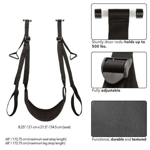 Transform your intimate moments with the Nocturnal Collection Sex Swing, a premium accessory designed to elevate your pleasure. Featuring sturdy door rods and a comfortable, padded seat, this sex swing offers unmatched support and control, allowing you to explore new positions with ease and comfort.Designed for use over a door, the Nocturnal Collection Sex Swing is built to hold up to 500 lbs., ensuring stability during your most passionate encounters. Adjustable foot straps and handles provide additional support, allowing you to customize your experience to fit your desires. This swing is perfect for adventurous couples looking to add excitement and versatility to their playtime.Crafted with a sturdy, double-stitched design, the Nocturnal Collection Sex Swing is both functional and durable, ensuring long-lasting use. The textured finish adds an extra layer of sensation, making this swing an essential addition to your bedroom. Enjoy the perfect blend of comfort, support, and thrill with the Nocturnal Collection Sex Swing, your key to unforgettable intimate experiences.