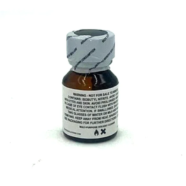 Contains: Isobutyl nitrite. Avoid contact with eyes and skin. Avoid prolonged breathing. In case of eye contact flush with water and get medical attention. If swallowed, give one or two glasses of water or milk and induce vomiting. Keep away from heat, sparks or flames .