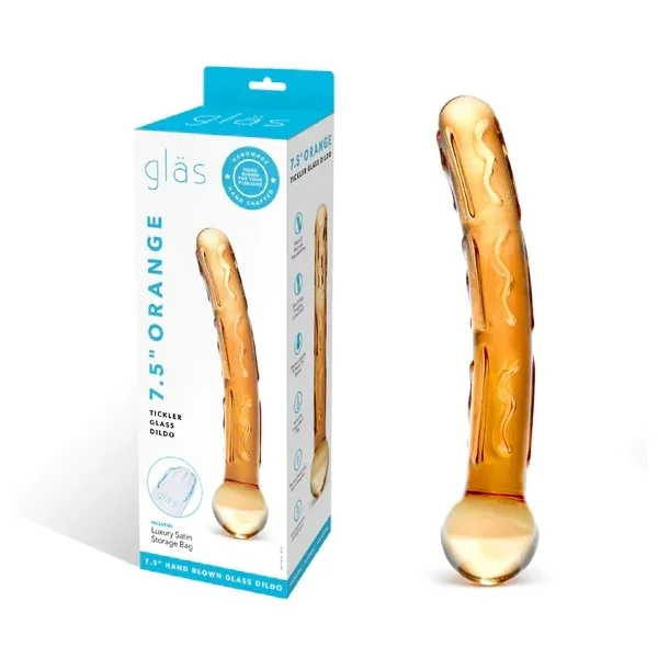 Tickle your fancy with the textured Orange Tickler Glass Dildo, which is designed to hit all the right spots! This artistically crafted glass toy features an easy grip base and raised ridges that hit all the right spots and creates friction for a hot, memorable experience. Made of fracture-resistant tempered glass, Glas pleasure products are long-lasting and safe to use. Experiment with the stimulating sensations of temperature play with the Orange Tickler Glass Dildo. Like other toys in the Glas line, the Orange Tickler Glass Dildo retains heat and cold to create one-of-a-kind sensations. Men and woman will love the user-friendly features of the Orange Tickler Glass Dildo. This hypoallergenic toy can be easily cleaned with soap and water for optimal sanitation. Anybody can use their favorite lube with Glas toys as all our pleasure products are compatible with all lubricants.