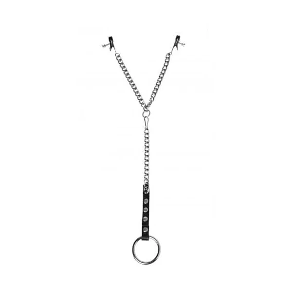 Get the best of both worlds with this nipple clamps and cock ring set. Two alligator style nipple clamps are attached to a 1.75-inch metal cockring via a chain and leather snap adjusted strip. Imagine what this would feel like if you were wearing it and walking around. We cockring sizes. Clean before and after each use with soap and warm water or toy cleaner.