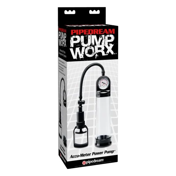 Pump Worx Accu Meter Power Pump from Pipedream Products. Discover thick, throbbing erections that last and last with this professional grade Accu-Meter Power Pump. Developed as a safe, affordable, non-surgical alternative to expensive medical procedures and pills, this hand held penis pump is the easy way to instantly enlarge your penis without any negative side effects. Simply insert your penis into the vacuum cylinder tube, squeeze the Easy grip trigger handle, and watch your pleasure rod swell with power! The soft PVC sleeve forms a perfectly tight seal against the skin and creates a powerful vacuum inside the chamber, forcing your erection to quickly expand its length and girth. The clear, vacuum cylinder allows you to see your cock get bigger and fatter with each squeeze of the lever, while the easy to read gauge lets you know how much pressure you have pumped. The tube is made from thick, heavy grade acrylic and marked with both metric and US standard graduations to measure your growth. The precision pressure gauge allows you to monitor your pumping progress and view the amount of vacuum pressure. When you have reached your desired size, simply push the quick release valve to instantly relieve the pressure and you are ready to play! To prolong ejaculation, slide an enhancement ring over your shaft until it is nice and snug. The tight squeeze will prolong cumming, help maintain your erection, and extend the fun. When you are done, simply detach the cylinder from the vacuum hose and restore it to like new quality with Pump Worx Toy Cleaner and warm water. Item penis pump bulk dimensions length 8 inches, width 2.75 inches, height 2.5 inches. Package dimensions depth 3.25 inches, width 5 inches, height 14.75 inches. Packaged shipping weight 1.25 pounds. Package type: Box. MaterialsABS Plastic, Acrylic, Thermoplastic Rubber TPR. Country of origin China. Harmonized Tariff Schedule HTS Code 4016996000. Pipedream Products Catalogs – Pump Worx. Categories: Sex Toys for Men, Penis Pumps, Male Pumps, Classic Pumps. 2022.
