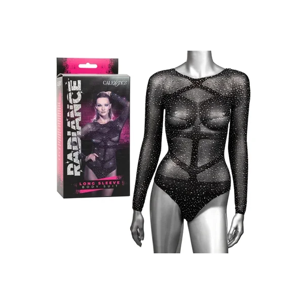 Watch your lover melt at the sight of you in the sparkling Radiance™ Long Sleeve Body Suit. The playful mesh bodysuit wraps your curves in a soft, breathable mesh, sparkling rhinestones, and an edgy design. Wrap your curves in a daring long sleeve bodysuit with the opaque and sheer mesh panel and sexy thong design. Sparkling rhinestone accents make curves shimmer with every movement. The soft stretchy mesh and body-forming fit are made for passionate playtime. The teasing teddy can be layered for a fierce festival look or worn by itself as luscious lingerie. The soft mesh bodysuit stretches to fit most standard sizes. Hand wash only.