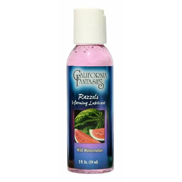 California Fantasies Razzels Warming Lubricant Wild Watermelon. Excellent lubricant that warms and tastes great! Six yummy flavors with no bitter after taste and sugar free. Warms as you rub it in and gently blow on it. Latex condom compatible. Sex toys friendly. 2 fluid ounces bottle. Instructions for use: apply a small amount of Razzels Flavored, Warming Lubricant to the desired areas of the body you wish to lubricate. Romance your lover by caressing their skin with your fingers then gently blowing on it to give them an enticingly warm sensation. With an arousing kiss of the lips, you will taste Razzels pleasurable flavor. Available is six yummy flavors, Razzels will keep you coming back for more so take your time and let your senses be dazzled! Razzels Warming Lubricant from California Fantasies. California Fantasies personal care products for romantic pleasures. 16