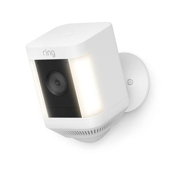 Enhance your home protection with the Ring Spotlight Cam Plus (Battery, White). This wireless outdoor security camera delivers 1080p HD video, color night vision, and motion-activated LED spotlights that light up potential intruders before they get close.