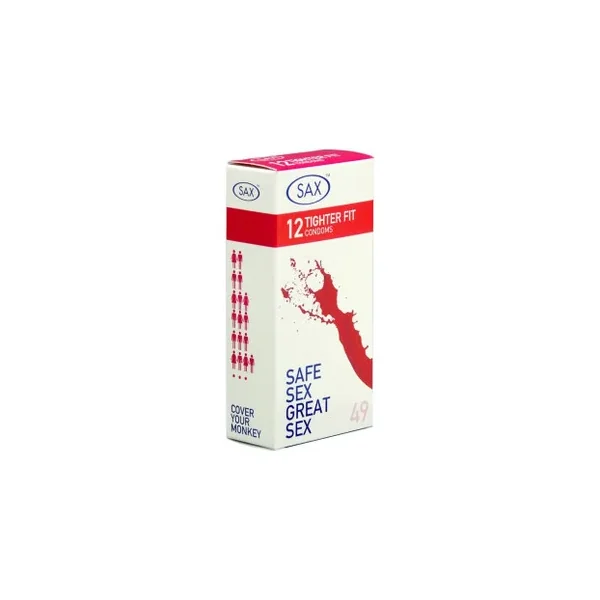 Sax Tighter Fit. 49mm nominal width. Pack of 12 condomsWhen you are looking to stock up some condoms for personal use Sax Condoms are a wonderful choice. These high quality condoms are designed to offer a safe and secure sex without compromising your intimacy. Sax condoms are made from high quality latex and are available in a wide range of sizes to fill every need. Whether you are looking for a standard size condom, ultra thin condoms, extra tighter fit condoms, bigger fit condoms, super max fit condoms or bulk condoms we have them all. What’s more, Sax condoms are priced cost-effectively to ensure you never have to think twice when stocking up on condoms and are Australian Owned. Grab a pack today.