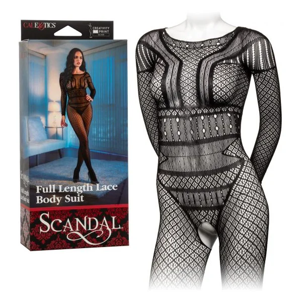 Scandal Full Length Lace Body Suit from California Exotic Novelties. Do not ask for attention: command it, with the Scandal Full Length Lace Body Suit. This mesh body suit is designed with your desires in mind, and will allow you to get fifty shades of seductive with this snug fitting body suit designed to show off your best assets. This sexy, full length play wear is designed to high light your body while fitting snugly and comfortably with the nylon mesh blend. The hand washable materials allow you to be sure that this garment will give you hours and hours of fun with your lover, night after night. Bring them to their knees with desire. In addition to it being a full length body suit, the crotchless design, which fits most standard sizes, ensures that there is zero interruption in your fun. Specifications: Color Black. Materials Nylon, Spandex. Phthalate free.90 days warranty. Package weight 3.9 ounces. Package 2 inches by 4.5 inches by 10.25 inches.