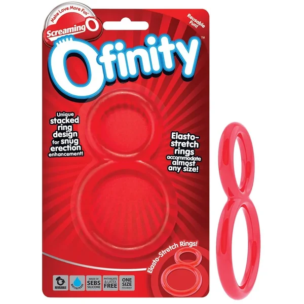 The Screaming O Ofinity double erection ring gives men an (almost) eternal erection with a unique isolation design that constricts blood flow for concentrated erection enhancement that lasts. The top ring stretches around the shaft while the bottom ring stretches around the testicles, each with a snug and tight fit that keeps erections harder for longer. Perfect for cock ring fans who don’t want the added sensation of vibration. Features: Stretchy double ring that lasts and lasts, Unique isolation design for the ultimate erection, Elasto-stretch rings accommodate almost any size member! Additional Information: Reusable, SEBS, Latex- and phthalate-free, Wireless, Waterproof.