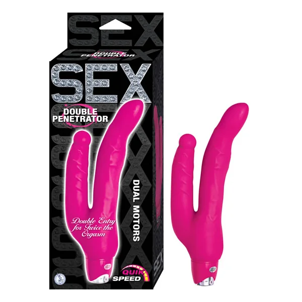 Sex Double Penetrator Pink Vibrating Dildo. Features: double entry for twice the orgasm. Dual motors. Quik Speed. Waterproof vibrations. Made using body safe RoHs compliant material PVC. Total length 10 inches, insertable length 6.5 inches and 4.25 inches, diameter tip 2 inches and 0.9175 inches. Diameter of shafts 1.5 inches and 1.25 inches. Vibrating dildo requires 2 AA batteries, not included. UPC 782631274219.