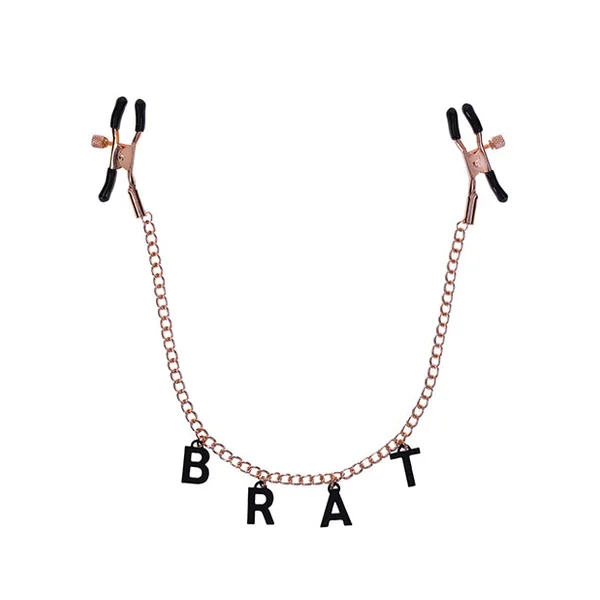Embrace your brattiest attributes and proudly display your naughtiness with the Brat Charmed Nipple Clamps! Adjust the tension and explore pleasure at every intensity with the rubber tipped, rose gold chained nipple clamps. Own every teasing quality you love with the black charms stretched across the chain labelling you for what you love to be, a “BRAT”!