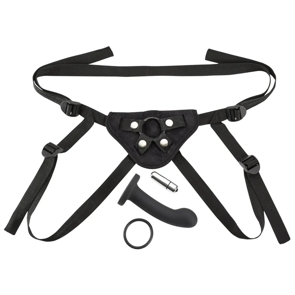 The cloud 9 pro sensual series strap on harness kit is perfect for those looking to expand their play with penetrative fun. This kit comes complete with a comfortable, adjustable harness featuring a durable, cushioned dildo pad covered in a velvety-soft material and sturdy nylon waist and thigh straps. Each kit also features a curved, 5.5″ dildo with a rounded head that is the perfect shape and length to stimulate muliple erogenous zones within the body, and is perfect for beginners and experienced users alike. A bonus 1-speed bullet is also included, which can be slipped into a pocket in the harness pad for additional stimulation.