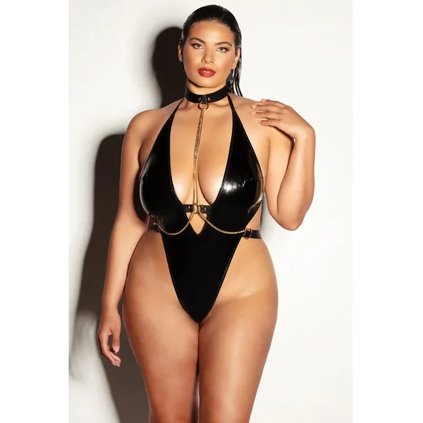 Submissive V-Plunge Vinyl Teddy w/Removable Chain Harness & Hand Cuff Black 1X/2X