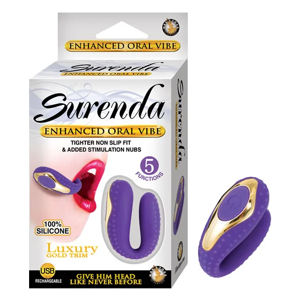 Surenda Enhanced Oral Vibe Purple with Luxury Gold Trim. 5 functions. 100% Silicone. USB cable included. Waterproof vibrations. Phthalate free, RoHS compliant material Vibe Silicone, Control Area ABS plastic. Length 2.25 inches, insertable length 2 inches diameter 0.625 inches, circumference 2 inches. Rechargeable, no batteries necessary.