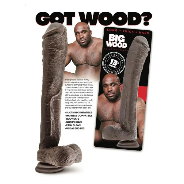 The Big Wood 13.5 inches Realistic Dildo from Freedom Novelties. The big wood stick. Its sturdy suction cup sticks to any smooth surface let the Big Wood fill you up hands free. Strap it into your o-ring harness for intense partner play. This toy is sculpted to include veins, balls and skin texture of a cock. The Big Wood’s 13.5 inches is formed from soft body safe PVC. To clean wash with soap and water or a sex toy cleaner and let dry before storage. Color Dark Brown.