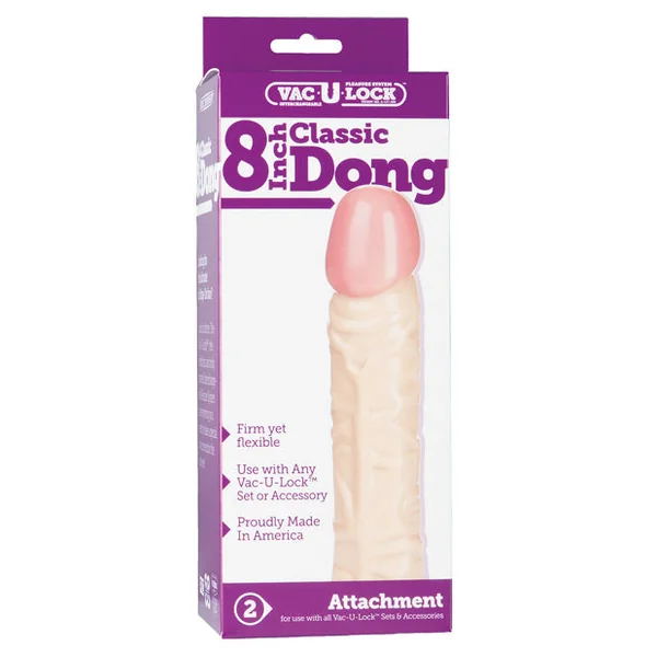 Experience nearly every variety of adult pleasure out there with the Vac-U-Lock modular system – a collection of snap-on, sex toy attachments for secure, comfortable strap-on intercourse! Your lover will beg for more when you lock and load the 8″ Classic Dong attachment for your leather harness. Simply connect the lifelike, textured, veiny cock with big tip and go all night long – from the front, from the back . . . whatever gets you off!