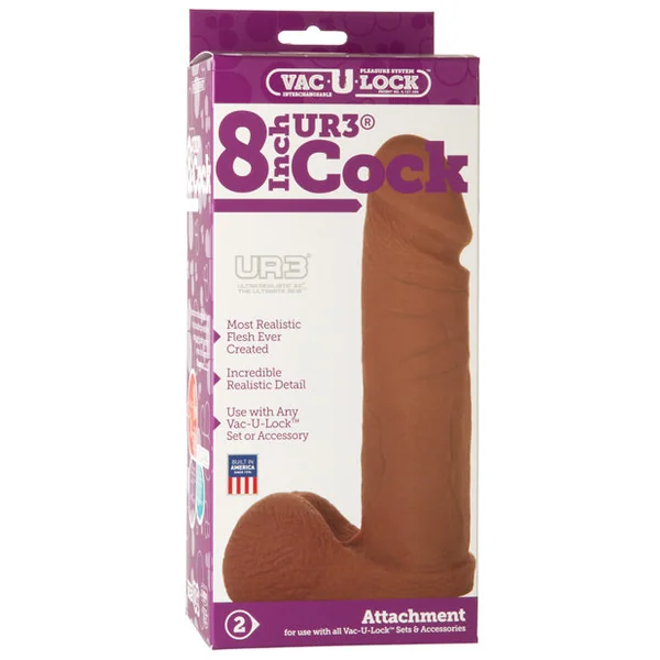 Doc Johnson’s Vac-U-Lock 6″ UR3 Cock Attachment. It’s hard to imagine more lifelike dongs than Doc Johnson’s Ultra-Realistic UR3 Dual-Density Cocks. These pieces are molded directly from a real cock- so they feature genuine detailing including plush balls, distinct veins, and bulbous heads. The Realistic UR3 Cocks were developed with a groundbreaking UR3 dual-density formula. They are formed with two layers: hard on the inside and soft on the outside, for the most authentic experience on the market. They even warm to the touch and recover their shape just like a real cock! Vac-U-Lock attachments can be paired with your favorite Vac-U-Lock harness or accessories for hours of rigorous play. Proudly made in America. Phthalate-free TPE with Antibacterial Sil-A-Gel formula. Works with all Vac-U-Lock Harness Systems and Accessories. Total Length: 8.4″, Usable Length: 8″, Diameter: 2″, Insertable Length: 8″.