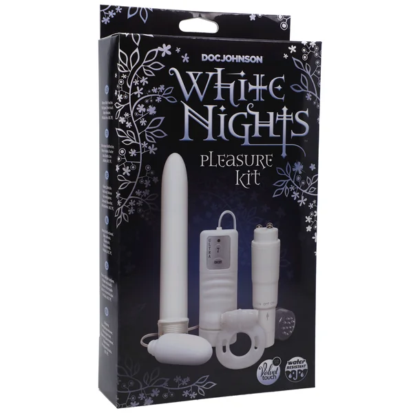 Stay up all night playing with these vibrators! This White Nights Pleasure Kit includes the best-selling 7-inch velvet-touch Vibe, a Pocket Rocket, the White Night Bullet Vibe, and a vibrating C-Ring to satisfy all of your naughty cravings.